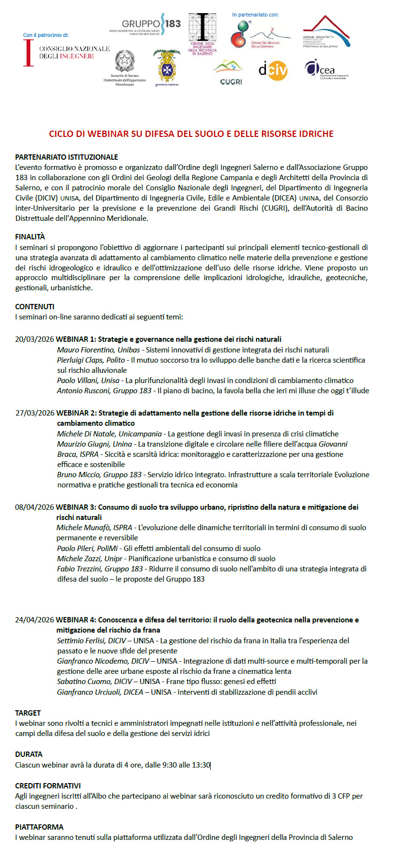 Prossimi appuntamenti 8 e 24 aprile - Webinar su Difesa del suolo e delle risorse idriche