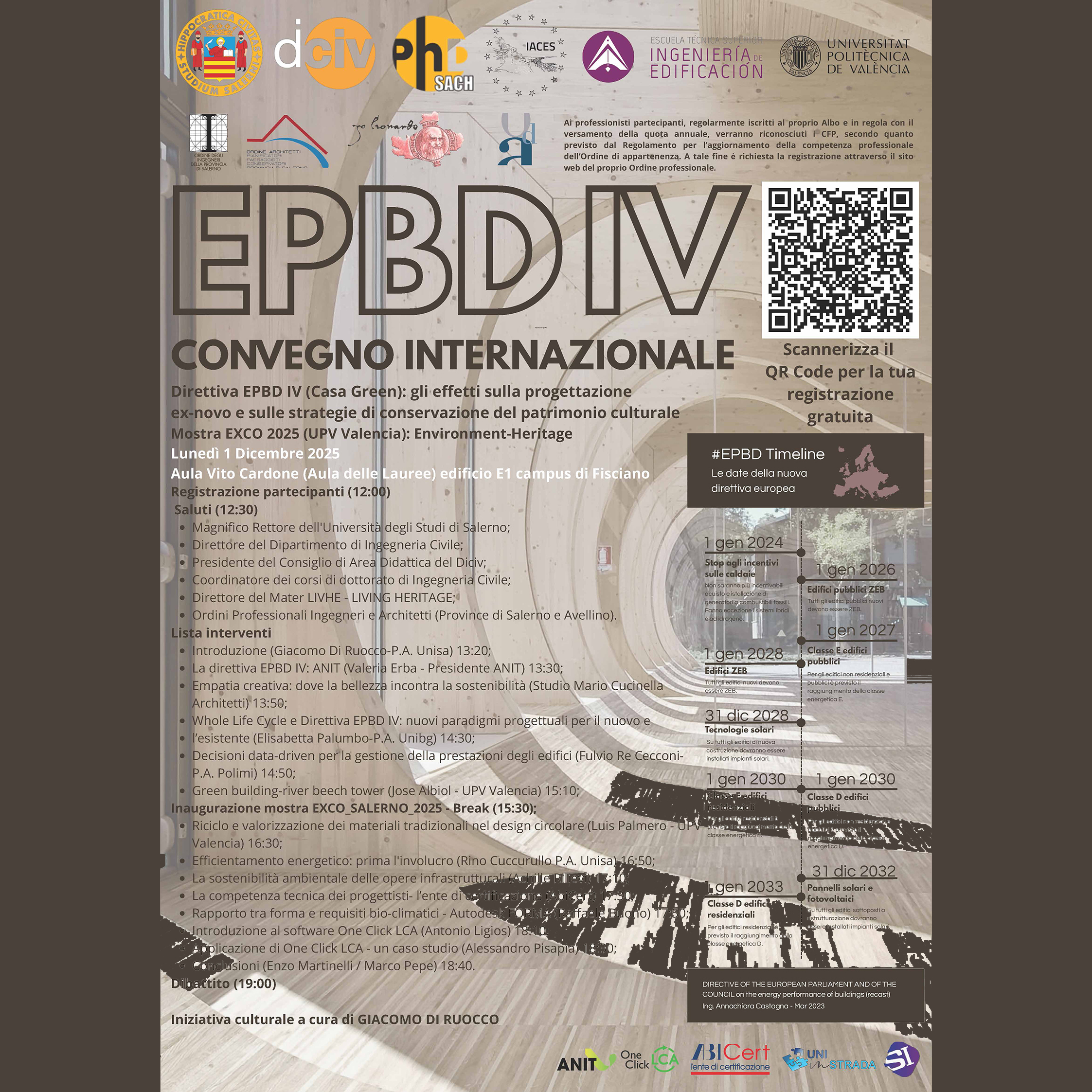 Direttiva EPBD IV (Casa Green): gli effetti sulla progettazione ex-novo e sulle strategie di conservazione del patrimonio culturale Mostra EXCO 2025 (UPV Valencia): Environment-Heritage Lunedì 1 Dicembre 2025 Aula Vito Cardone (Aula delle Lauree) edificio E1 campus di Fisciano