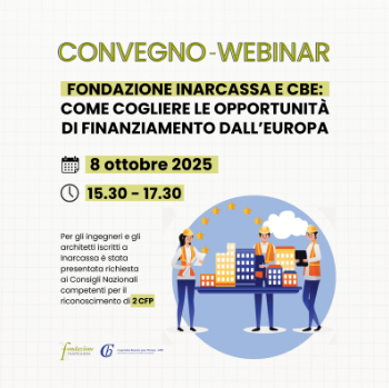 “Fondazione Inarcassa e CBE: come cogliere tutte le opportunità di finanziamento dall’Europa”, organizzato dalla collaborazione Fondazione Inarcassacon Coopération Bancaire pour l'Europe – GEIE di Bruxelles, in programma mercoledì 8 ottobre, dalle ore 15.30 alle ore 17.30.