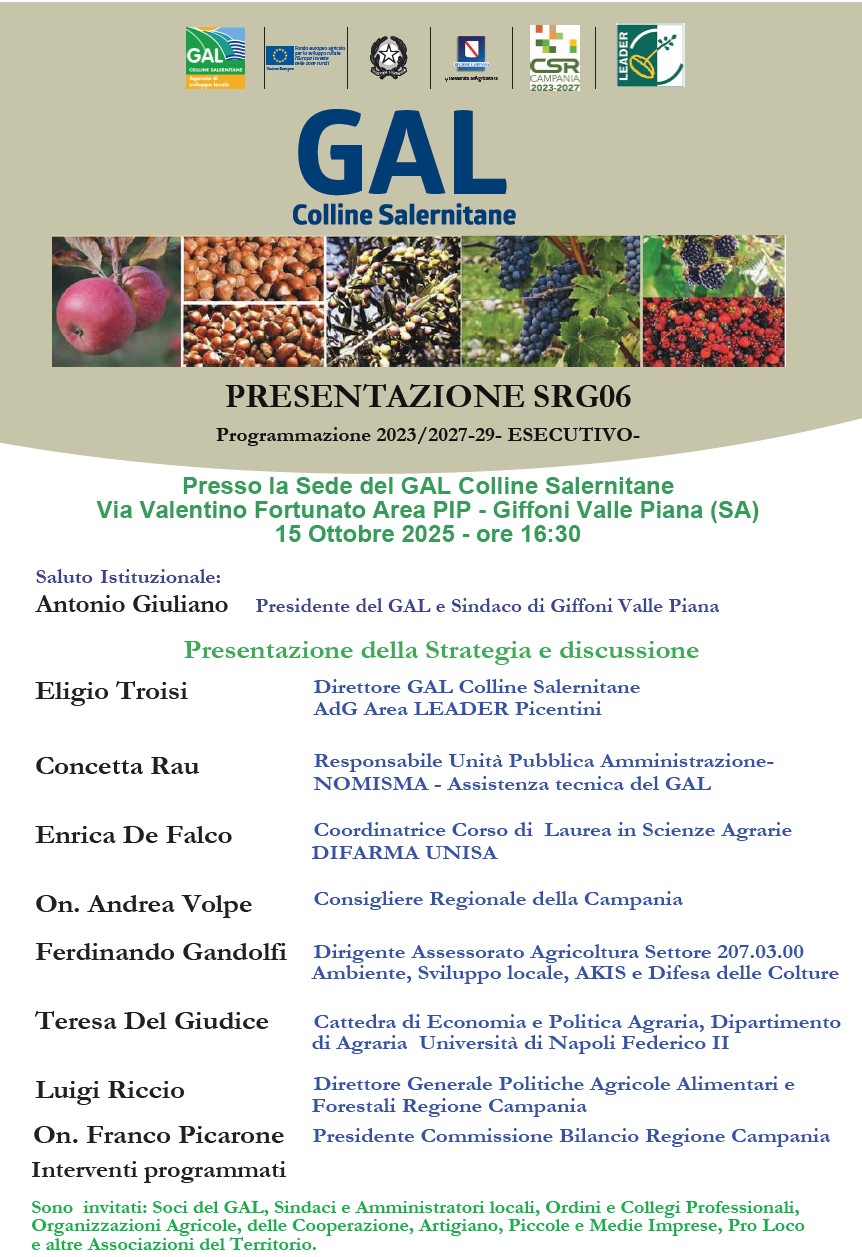 Il 15 ottobre 2025 , presso la sede del GAL Colline Salernitane a Giffoni Valle Piana , sarà presentata la nuova Strategia di Sviluppo Locale SRG06 (2023–2027) e i relativi bandi a regia diretta e a regia GAL.