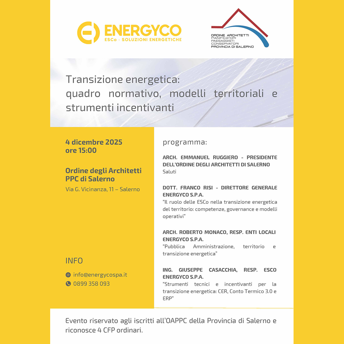 - Location: Sede dell'Ordine Via Giacinto Vicinanza, 11 84123, Salerno